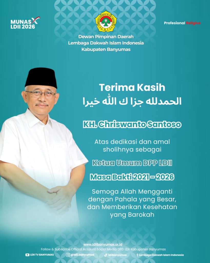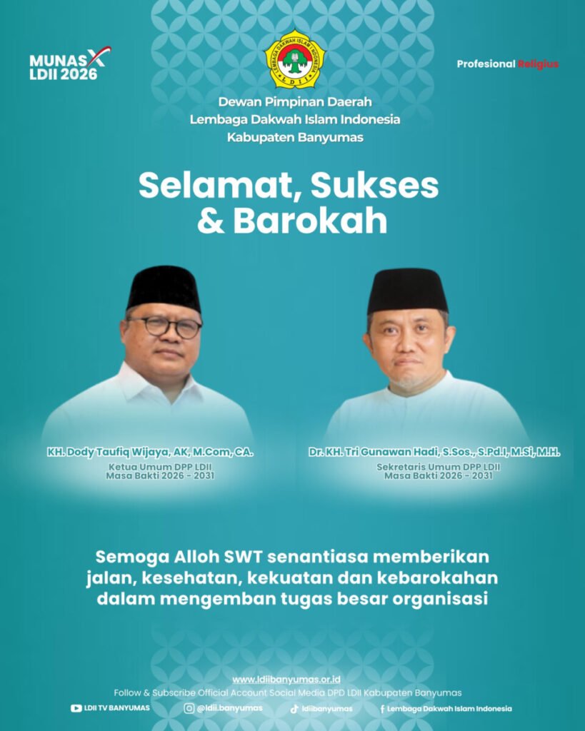 Keluarga Besar Dewan Pimpinan Daerah Lembaga Dakwah Islam Indonesia Kabupaten Banyumas mengucapkan: Selamat, Sukses & Barokah KH. Dody Taufiq Wijaya & KH. Tri Gunawan Hadi yang telah terpilih sebagai Ketua Umum dan Sekretaris Umum DPP LDII Masa Bakti 2026-2031 melalui Musyawarah Nasional X LDII 2026 Semoga Allah membimbing dan memberikan kekuatan serta kemudahan dalam mengemban…